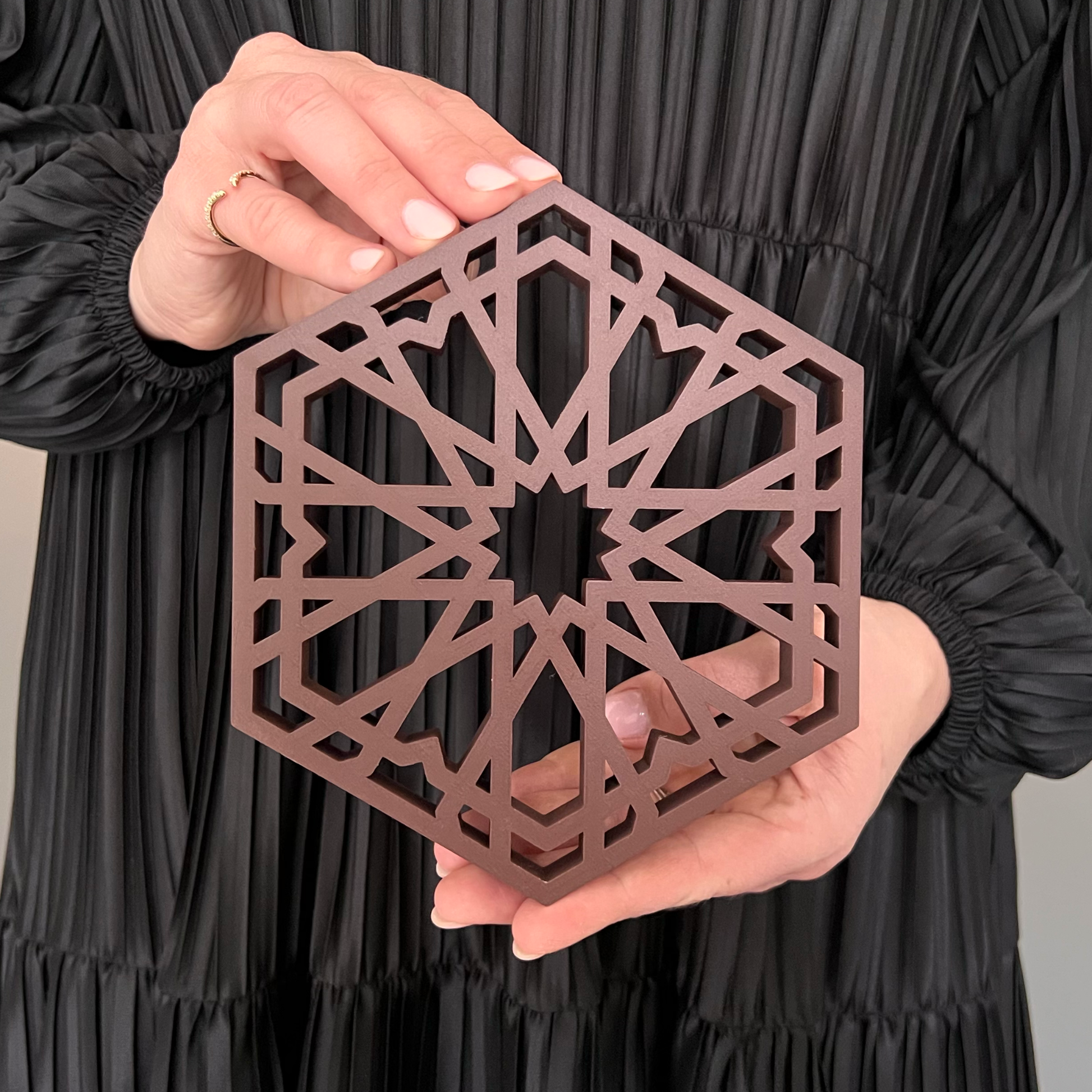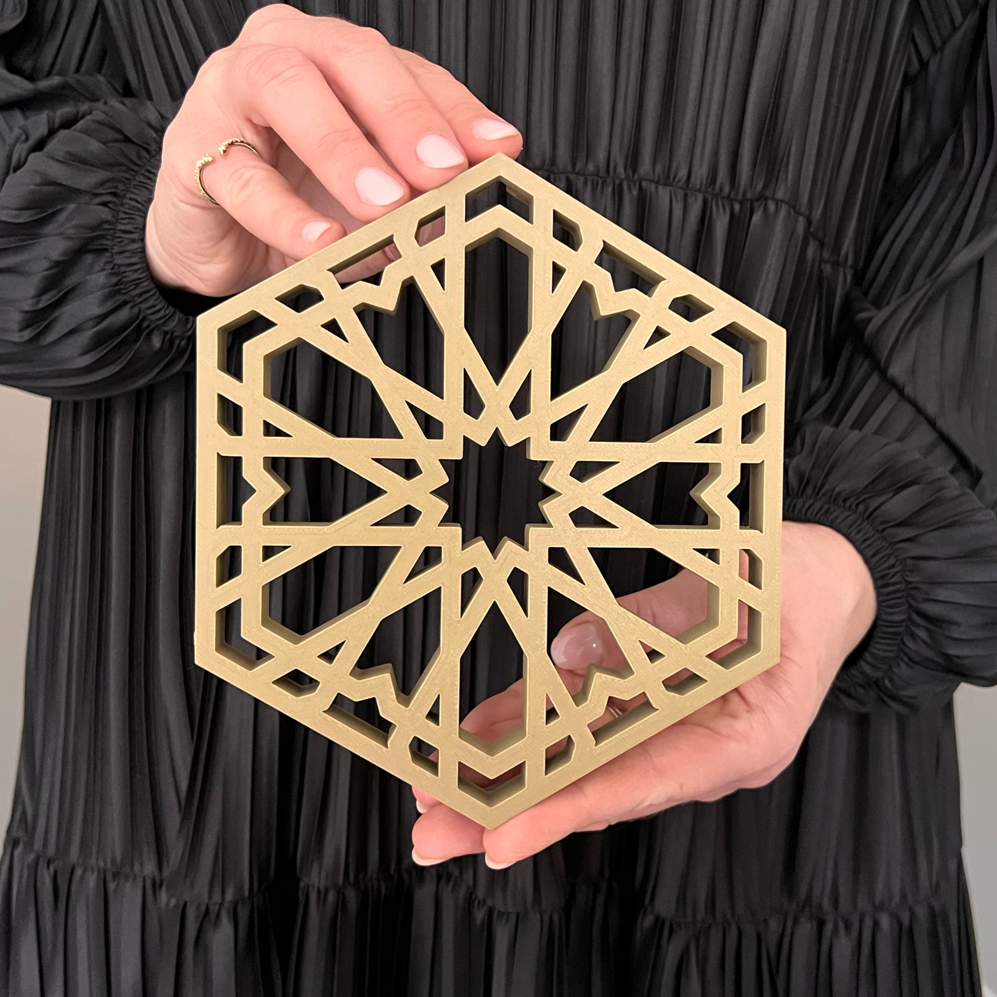 This hexagonal wall piece blends careful craftsmanship with centuries-old design tradition. The pattern draws inspiration from the palaces of Al-Andalus, where intricate ornamentation transformed architecture into art. Influenced by Mudejar craftsmanship, a style where Islamic and European artistic traditions converged, this design captures the harmony and complexity of a remarkable era.