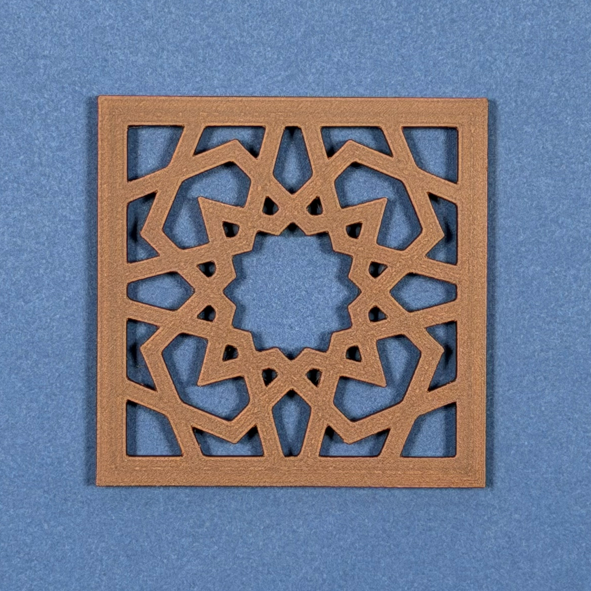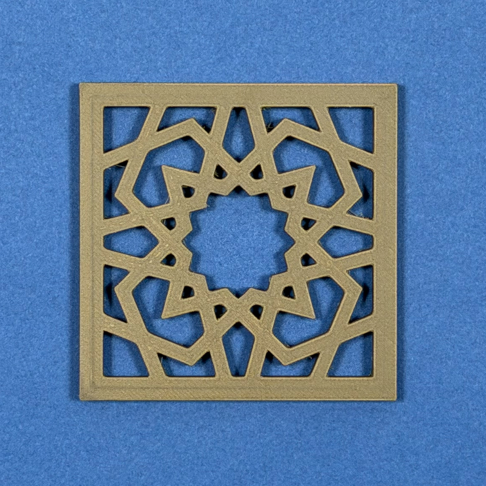 The pattern echoes the rhythmic interlacing of brick facades and carved ornament characteristic of Baghdad’s medieval architecture. Angular repetition and carefully structured layering reflect the clarity and decorative restraint that distinguished the city’s historic buildings.
