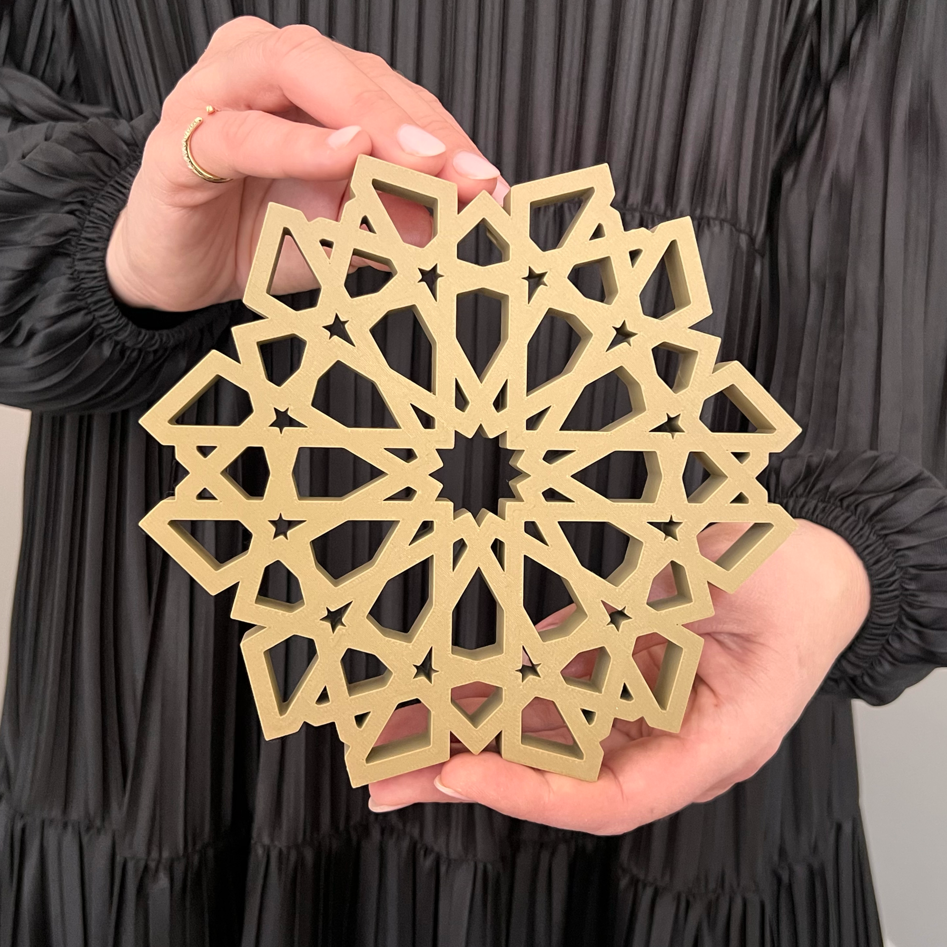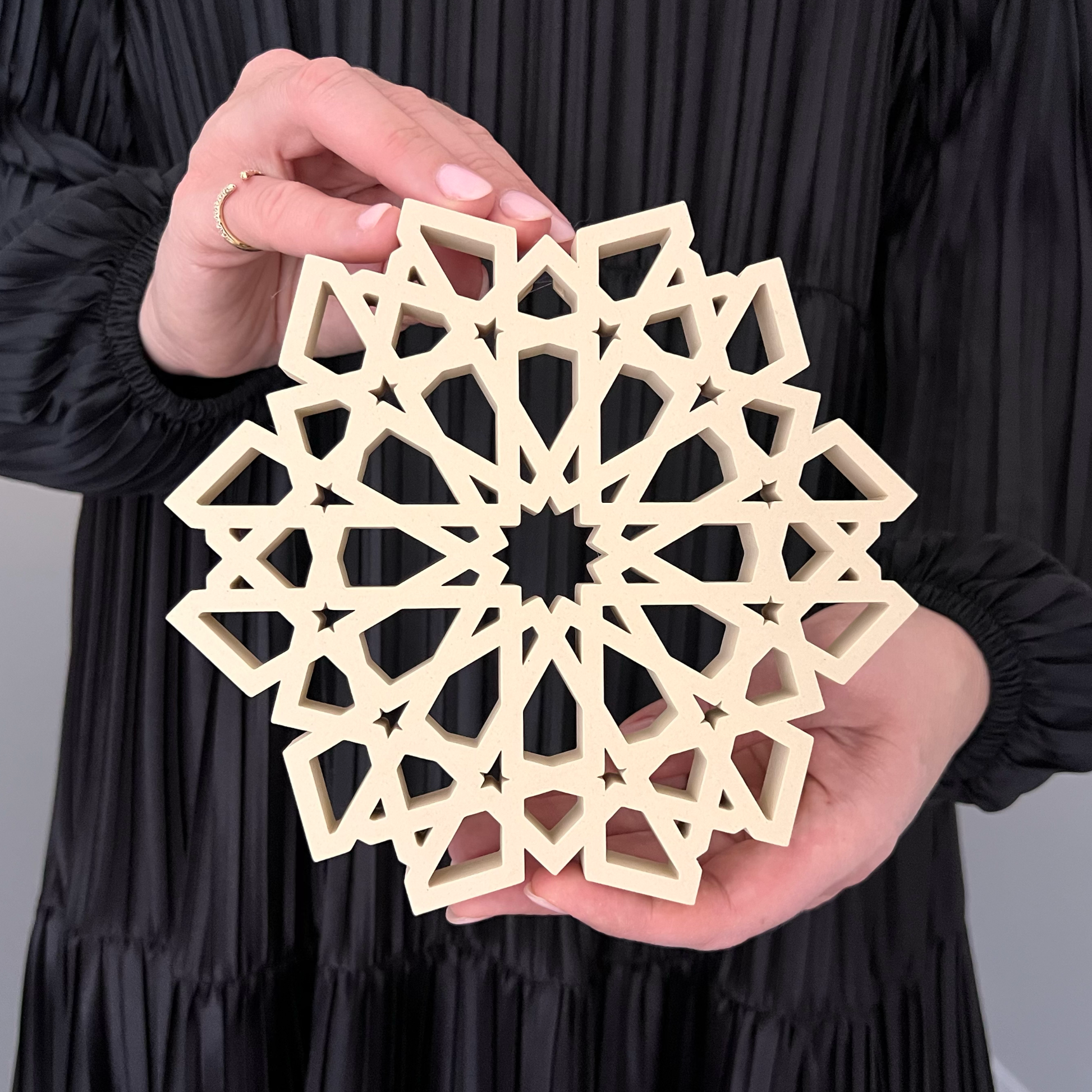 This circular design features a twelve-fold star at its core, surrounded by a complex network of interlocking polygons, curved forms, and negative space. The layered structure gives the piece a sense of movement and balance, while small embedded star motifs add a playful but intentional detail that echoes the architectural richness of the Islamic West.